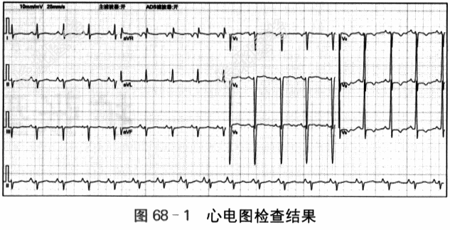 =33mm。ST段正常。T波广泛性低平或倒置。结论:左心室增大伴心肌劳损。如图68-1所示。