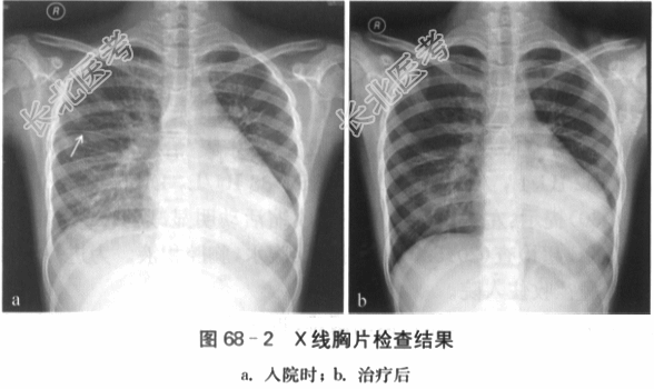 (2)胸部X线检查:胸廓对称,气管居中。两侧透亮度正常,肺纹理显著,未见明显渗出影,双侧中下肺野外带见克氏B线,水平裂增厚,右侧胸膜影稍增宽。肺门影增浓,肺门角欠清晰。心影明显增大,心尖向左下延伸,心胸比例0.60。左膈面显示不清,右膈面光整,右侧肋膈角锐利。结论:心影增大,间质性肺水肿(见图68-2-a)。治疗1周后,心影仍大,间质性肺水肿好转(见图68-2-b)。