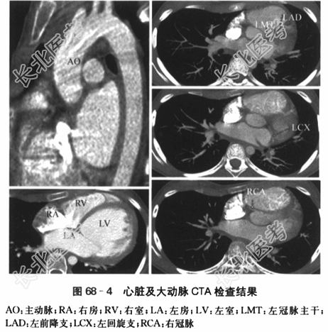 2015年5月18日复查:①左室内径显著增大,LVEDD61mm,LVESD49mm,心功能不全LVEF40%;②左室内占位基本消失;③二尖瓣反流(轻度);④肺动脉高压(轻度)。 (4)24h动态心电图:①窦性心动过速。②单一形态室性早搏1823次/24h,见6对成对出现。③ST-T段改变。④QRS电交替。 (5)心脏及大动脉计算机断层血管造影(CTA):心影增大,左室为著,左室内壁毛糙;主动脉弓未见明显异常;冠状动脉起源未见异常。如图68-4所示。