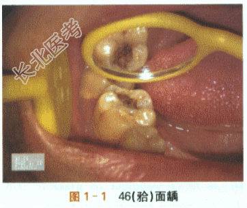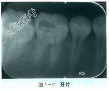 患者,女性,21岁,近3个月来,右下后牙咀嚼时经常出现疼痛,有时疼痛较重,换到左侧咀嚼疼痛就会缓解。平时吃冷热食物时,右下后牙也会感到疼痛。否认牙齿有自发痛病史,否认牙齿有夜间痛病史。既往史:否认牙病诊疗史,否认系统性疾病史,否认药物过敏史。查体:46面远中窝可见大而深的龋洞,内有食物残渣,去除食物残渣后可见大量的灰黑和黄褐色的龋坏组织(见图1-1),质软,轻用力可挑起部分龋坏组织,有轻度探痛。面近中窝可见小而浅的龋洞,色黑,探诊质地硬。颊面点隙可见黑色的点状龋洞,较浅,质硬,无探痛。颊颈部龈缘可见条带状浅黄色的菌斑,附着龈呈粉红色,边缘龈呈暗红色,无肿胀,探诊深度约2mm,无探诊出血。叩诊无疼痛,咀嚼棉卷无疼痛。冰条冷试验中度疼痛,无延迟痛。44、45、47未及明显龋损,牙周情况可。辅助检查:牙片检查发现46面远中可见透射影像近髓,根尖未见低密度影(见图1-2)。