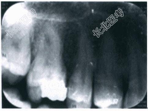 面可见大块牙色充填体,探诊充填体边缘密合,牙齿无探痛,垂直叩诊(+++),侧向叩诊(+),扪诊根尖部(+),无波动感,松动Ⅰ度,冷诊无反应,电活力测试无反应;牙龈略红肿,触诊不痛;根尖部颊黏膜红肿;余牙检查无特殊情况。5.辅助检查 X线片检查示:16冠部充填物影像,牙周膜间隙增宽,髓室及近中颊根管影像不清,根尖未见明显异常(见图10-1)。