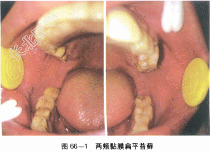 患者,男性,52岁,1月前发现两颊白色花纹,伴白色斑点分布,自觉有粗糙感。进食辛辣、热、酸、咸等刺激性食物,病损部位有灼痛感。于当地医院就诊,服用"罗红霉素"及中药颗粒(药名不详),服后未见好转。无其他皮肤及指(趾)甲其他部位病损。既往史:斑秃史,否认高血压史,否认心脏病、糖尿病史,否认消化系统病史,否认肝肾病史,否认其他系统病史,否认吸烟史,否认过敏史。查体:患者开口度正常。两侧颊部黏膜见网状白色花纹对称分布,并散布9有淡白色斑点,稍突出黏膜表面,质软。白色病损区黏膜轻微充血(见图66-1)。身体其他部位未见明显皮肤病损,指(趾)甲未见明显病损。辅助检查:就诊1周前的实验室检查显示:真菌培养阴性,血糖、肝功能、肾功能正常,电解质正常。