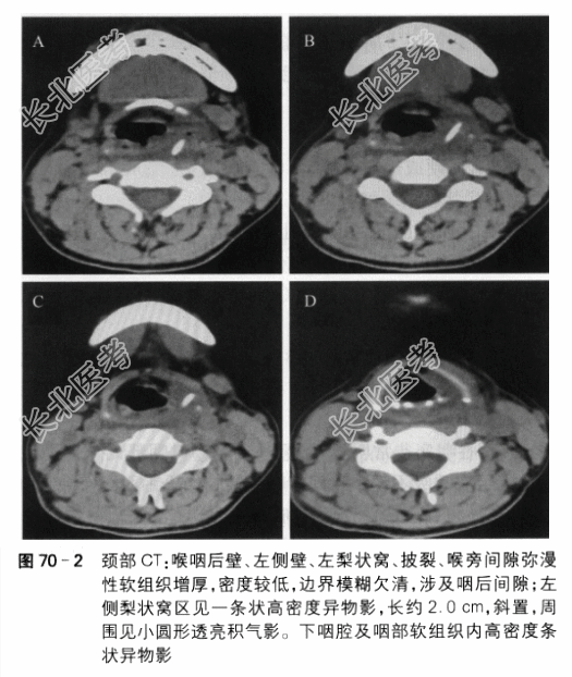 (3)颈部CT检查提示左侧喉咽部异物(主要位于梨状窝区)伴炎症感染(见图70-2)。