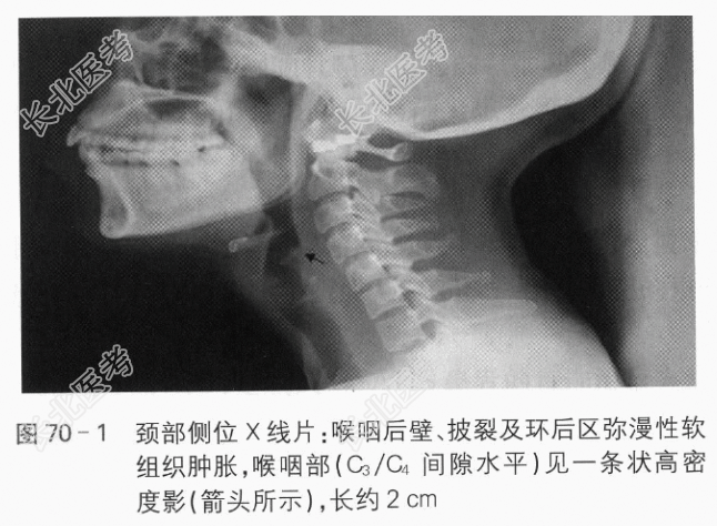 辅助检查:(1)硬管喉镜:会厌谷及右侧梨状窝光滑未见异物,左侧梨状窝黏膜充血肿胀,组织拥挤。(2)颈部侧位X线片提示左侧喉咽部异物伴感染可能(见图70-1)。