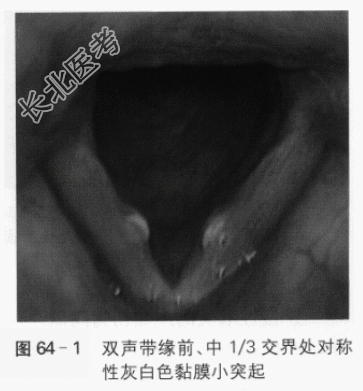 辅助检查:硬管喉镜检查提示:双声带游离缘前、中1/3交界处黏膜小突起,色白,光滑,对称(见图64-1)。