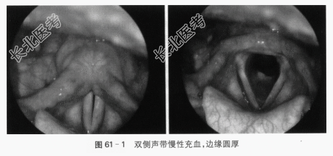 辅助检查:喉镜检查提示喉黏膜广泛增厚,杓状软骨处黏膜及杓会厌襞增厚,以杓间区最为显著,声带充血,边缘圆厚,表面粗糙不平,会厌及双侧梨状窝未见明显新生物(见图61-1)。