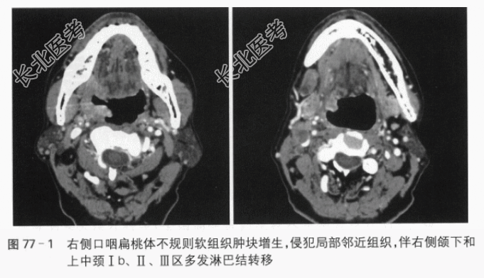辅助检查:(1)活检病理结果示:(右扁桃体)鳞状上皮细胞癌。(2)口咽及颈部增强CT检查示:右侧口咽扁桃体弥漫性不规则软组织肿块增生,约2.2cm×2.0cm×3.5cm,增强扫描不均匀强化,边界欠清晰,向前达右侧腭舌沟,下达右侧舌根,向内侵犯右侧软腭,外端咽旁间隙,双侧颌下区淋巴结肿大,右侧为著伴液化,约2cm×1cm,右上中颈部Ⅱ、Ⅲ区多个肿大淋巴结,约1.2~1.8cm,伴液化坏死。右侧口咽扁桃体不规则软组织肿块增生,侵犯右腭舌沟、舌根、软腭和咽旁间隙,右颌下和上中颈Ⅰb、Ⅱ、Ⅲ区多发淋巴结转移,左侧颌下可疑淋巴结转移(见图77-1)。