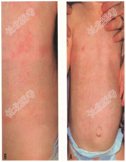 - [材料题] 患儿,男,20个月,因“发热3天,皮疹半天”就诊。3天前无明显诱因下出现高热,最高体温39.4℃,伴轻度腹痛,精神可,食欲较平素略有下降。家长自用退烧药,体温反复,最高可达39.9℃,精神食欲尚可。昨日患者至医院就诊,门诊给予中药治疗(具体不详)。今日下午患者体温正常,颈部首先出现皮疹,后迅速累及面部及四肢,无明显瘙痒症状。患者再次至门诊就诊,诊断为“幼儿急疹”,嘱患者家属密切观察,加强护理。追问病史,患者为足月顺产,母乳喂养至1岁,按时添加辅食,生长发育正常。既往史:否认传染病史,否认手术外伤史,否认输血史,否认过敏史。足月顺产,按时接种疫苗。查体:T 36.5℃,P 110次/min,R 20次/min,Wt 20 kg。神志清楚,精神可,营养可,颈部淋巴结肿大。头颅无畸形,巩膜无黄染。双侧瞳孔等大等圆,对光反射灵敏。咽部充血,颈软,无抵抗,双肺呼吸音清晰,未闻及干、湿性啰音。腹平坦,腹壁软,全腹无压痛,无肌紧张及反跳痛,肝脾肋下未触及,肝肾脏无叩击痛。脊柱、四肢无畸形。肌力正常,肌张力正常,生理反射正常,病理反射未引出。皮肤科体检:颈部、躯干、四肢泛发点状至粟米大小玫瑰色、红色丘疹、斑丘疹,互不融合,压之褪色。如图所示。血常规:WBC 9.8×10⁹,RBC 4×10¹²,Hb 110 g/L,N 60%,L 20.1%,MO 15%。