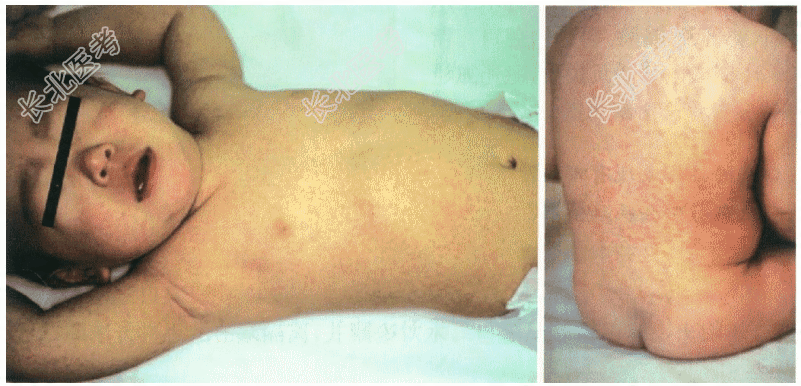 - [材料题] 患儿,男性,4岁。因“全身皮疹1天”入院。患者1天前面颈部出现散在粟粒大小红色皮疹,后逐渐发展增多,24h内迅速蔓延至颈部、躯干、上肢,最后到下肢,部分融合成片,至我院门诊就诊,查血常规示:WBC 3.0×10⁹/L,RBC 4.20×10¹²/L,Hb 135 g/L,PLT 220×10⁹/L,N 33.5%,LY 55%,MO 10%。追问病史,患者发病前两天曾有低热,咽痛史,发病前两周所在学校有类似患儿。既往史:否认传染病史,否认手术外伤史,否认输血史,否认过敏史。足月顺产,按时接种疫苗。体格检查:T 37.1℃,P 80次/min,R 20次/min,BP 100 mmHg/65 mmHg。神志清楚,精神可,营养好,回答切题,自动体位,查体合作,枕骨下及后颈部淋巴结肿大,稍有压痛,其余全身浅表淋巴结无肿大。头颅无畸形,眼睑正常,睑结膜未见充血,巩膜无黄染。双侧瞳孔等大等圆,对光反射灵敏。颈软,无抵抗,甲状腺无肿大。胸廓对称无畸形,胸骨无压痛;双肺呼吸音清晰,未闻及干、湿性啰音。腹平坦,腹壁软,全腹无压痛,无肌紧张及反跳痛,肝脾肋下未触及,肝肾脏无叩击痛。脊柱、四肢无畸形。肌力正常,肌张力正常,生理反射正常,病理反射未引出。皮肤科体检:面部、颈部、躯干、四肢可见弥漫粟粒大小红色斑疹、斑丘疹或丘疹,部皮疹融合成片。如图所示。实验室及影像学检查或特殊检查:WBC 3.0×10⁹/L,RBC 4.20×10¹²/L,Hb 135 g/L,PLT 220×10⁹/L,N 33.5%,LY 55%,MO 10%。