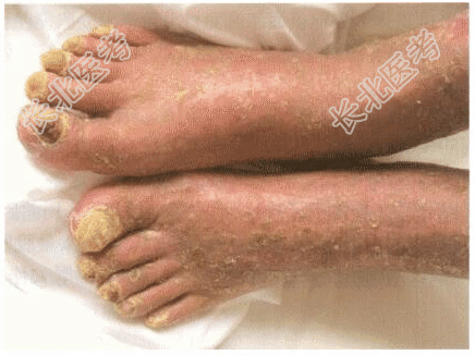 既往史:既往无高血压史、糖尿病史、心脏病史;无肺结核史及其他传染病史;否认食物药物过敏史。预防接种不详。体格检查:T 36.6℃,HR 80次/min,律齐,BP 130 mmHg/75 mmHg,神志清楚,精神可,营养好,回答切题,自动体位,查体合作,双侧腋下及腹股沟淋巴结肿大。头颅无畸形,巩膜无黄染。双侧瞳孔等大等圆,对光反射灵敏。颈软,无抵抗,甲状腺无肿大。胸廓对称无畸形,胸骨无压痛;双肺呼吸音清晰,未闻及干、湿性啰音。腹平坦,腹壁软,全腹无压痛,无肌紧张及反跳痛,肝脾肋下未触及,肝肾脏无叩击痛。脊柱、四肢无畸形。肌力正常,肌张力正常,生理反射正常,病理反射未引出。皮肤科体检:头皮及面部散在分布暗红色斑丘疹,少许鳞屑。全身皮肤广泛潮红肿胀,上覆厚层银白色鳞屑,以躯干和双小腿为重。双下肢可凹性肿胀,可见散在抓痕、皲裂及少许渗出,指(趾)甲变形,甲板增厚、混浊。如图所示。血尿常规正常。肝肾功能:ALT 39 IU/L,AST 33 IU/L,AKP 60 IU/L,γ-GT 34 IU/L,TP 52.5 g/L,ALB 28.5 g/L。Cr 64 μmol/L,BUN 6.5 mmol/L,UA 336 μmol/L。电解质:K⁺ 4.0 mmol/L,Na⁺ 138 mmol/L,Cl⁻ 104 mmol/L,Ca²⁺ 2.13 mmol/L。空腹血糖4.01 mmol/L。血脂:TG 1.93 mmol/L;CHO 3.17 mmol/L。ANA、ENA、ds-DNA(-)。辅助检查:心电图正常。胸片:双肺纹理增多。B超:脂肪肝趋势,左肾结石,胆囊、胰腺、脾脏、右肾未见明显占位。