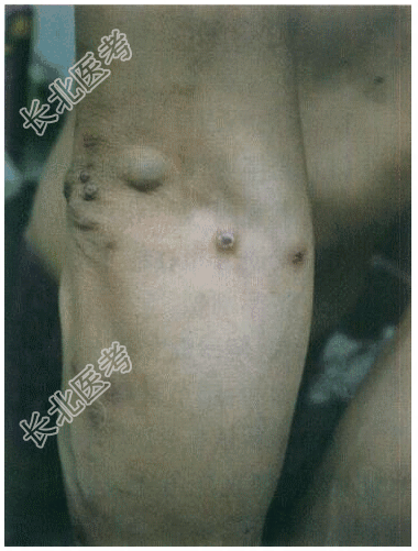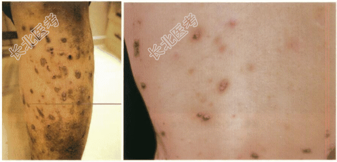 - [材料题] 患者,男,67岁,因“躯干四肢皮疹伴痒30余年,加重3月”入院。30年前患者无明显诱因出现躯干、四肢红色皮疹,绿豆至黄豆大小,稍高出皮面,瘙痒明显。患者自行涂用外用药膏(具体不详),效果不佳,反复有新发结节出现。3月前无明显诱因患者全身皮疹加重,瘙痒剧烈,搔抓后有渗血。我院门诊查血常规检查示WBC 7.14×10⁹/L,Hb 119 g/L,PLT 199×10⁹/L,嗜伊红细胞476×10⁶/L,先后予抗组胺药、复方甘草酸苷片和雷公藤多苷片等口服,并外涂糖皮质激素类软膏,患者皮疹及瘙痒未见好转。后复查血常规:WBC 6.4×10⁹/L、Hb 109 g/L、PLT 160×10⁹/L,嗜伊红细胞858×10⁶/L,为行进一步诊治收治入院。患者病程中无发热,无咳嗽、咳痰,无胸闷、胸痛等不适。患病以来患者精神好,胃纳可,睡眠好,大小便正常,无体重明显下降。既往史:否认肝炎史,否认结核史,否认手术史和外伤史,否认输血史,否认食物、药物过敏史。预防接种史不详。各系统回顾无特殊。体检检查:T 36.6℃,P 76次/min,R 20次/min,BP 127 mmHg/80 mmHg,神志清楚,发育正常,营养好,回答切题,自动体位,查体合作,步入病房,无肝掌,全身浅表淋巴结无肿大。头颅无畸形,眼睑正常,睑结膜未见异常,巩膜无黄染。双侧瞳孔等大等圆,对光反射灵敏,耳廓无畸形,外耳道无异常分泌物,无乳突压痛。外鼻无畸形,鼻通气良好,鼻中隔无偏曲,鼻翼无扇动,两侧鼻旁窦区无压痛,口唇无发绀。双腮腺区无肿大,颈软,无抵抗,颈静脉无怒张,气管居中,甲状腺无肿大。胸廓对称无畸形,胸骨无压痛;双肺呼吸音清晰,未闻及干、湿啰音。HR 76次/min,律齐;腹平坦,腹壁软,全腹无压痛,无肌紧张及反跳痛,肝脾肋下未触及,肝肾脏无叩击痛,肠鸣音4次/min。肛门及外生殖器未见异常,脊柱、四肢无畸形,关节无红肿,无杵状指(趾),双下肢无水肿。肌力正常,肌张力正常,生理反射正常,病理反射未引出。皮肤科检查:四肢、躯干可见多发淡红色丘疹、结节,可见抓痕、血痂和色素沉着,未见水疱。口腔、黏膜未见明显皮损,毛发分布正常,甲板未见异常,如图所示。血常规检查:WBC 6.4×10⁹/L,Hb 109 g/L,PLT 160×10⁹/L,嗜伊红细胞858×10⁶/L。电解质:K⁺ 3.4 mmol/L,Na⁺ 139 mmol/L,Ca²⁺ 2.16 mmol/L。肝功能:ALT 15 IU/L,AST 21 IU/L,ALB 33 g/L。肾功能:Cr 71 μmol/L,BUN 4.6 mmol/L。