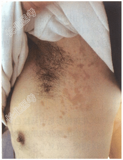 - [材料题] 患者,男性,28岁。因“颈、躯干部皮疹反复3年,夏重冬轻”来皮肤科门诊诊治。患者于3年前的夏天颈部和躯干部出现褐色的皮疹,天气凉快后皮疹颜色较淡,冬天皮疹不明显,甚至呈白色,自觉无任何不适,故未予治疗。之后,每年天气热后就出现,冬天又减轻,反复3年。患者平时热爱运动,出汗较多。既往史:否认传染病史,否认手术外伤史,否认输血史,否认过敏史,否认高血压和糖尿病等其余系统疾病。查体:T 36.8℃,P 90次/min,R 20次/min,BP 110 mmHg/70 mmHg。神志清楚,精神好,营养好,回答切题,自动体位,查体合作,全身浅表淋巴结无肿大。头颅无畸形,巩膜无黄染。双侧瞳孔等大等圆,对光反射灵敏。颈软,无抵抗,甲状腺无肿大。胸廓对称无畸形,胸骨无压痛;双肺呼吸音清晰,未闻及干、湿性啰音。腹平坦,腹壁软,全腹无压痛,无肌紧张及反跳痛,肝脾肋下未触及,肝肾脏无叩击痛。脊柱、四肢无畸形。肌力正常,肌张力正常,生理反射正常,病理反射未引出。皮肤科体检:颈、胸、腋下和背部可见散在多枚黄豆至蚕豆大小褐色圆形或类圆形斑片,部分融合,上覆糠秕状细小鳞屑。如图所示。鳞屑真菌直接镜检:可见大量的短小棒状菌丝和圆形、卵圆形厚壁孢子。