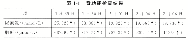 (1)肾功能检查结果 见表1-1(正常值:尿素氮为2.9~7.14mmol/L,肌酐为53~132.6μmol/L)。