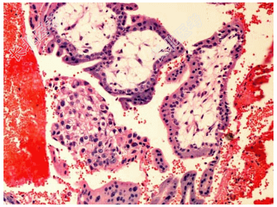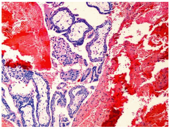 - [材料题] 患者女性,36岁,停经50余天,腹痛一天,后穹窿穿刺少量新鲜血,术中见右输卵管壶腹部膨大并有活动性出血。切除右输卵管,显微镜下所见如图。临床诊断为输卵管妊娠。