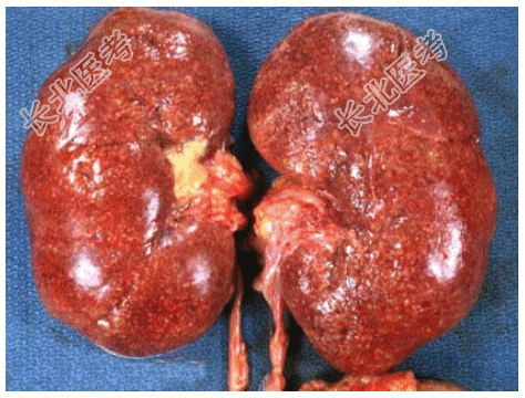 - [材料题] 死者,女性,28岁。因败血症死亡。发病初期曾有持续发热、腰痛、尿频、尿急、脓尿等症状。尸检见双肾肿大,包膜紧张,肾盂肾盏黏膜充血、水肿、表面有脓性分泌物,并可见小脓肿(如图),镜检如图所示。