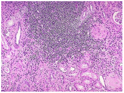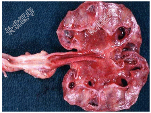 - [材料题] 患者女性,53岁,双肾缩小,表面可见不规则瘢痕,两侧改变不对称,切开,皮髓质界限不清,肾乳头萎缩,肾盏和肾盂因瘢痕收缩而变形,肾盂黏膜粗糙;巨检如图,镜下如图所示。