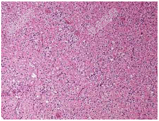 - [材料题] 患者男性,40岁,头痛、头晕3个月,加重1周。CT示左侧额叶一占位性病变,周围水肿轻微,占位效应明显,增强扫描后病灶无明显强化,考虑左侧额叶肿瘤。术后送检。镜检如图所示:瘤细胞胞浆空泡状,核圆形居中,弥漫分布,似“棋盘格”状。部分区间质出血及钙化灶。临床考虑诊断为左额叶少突胶质细胞瘤。
