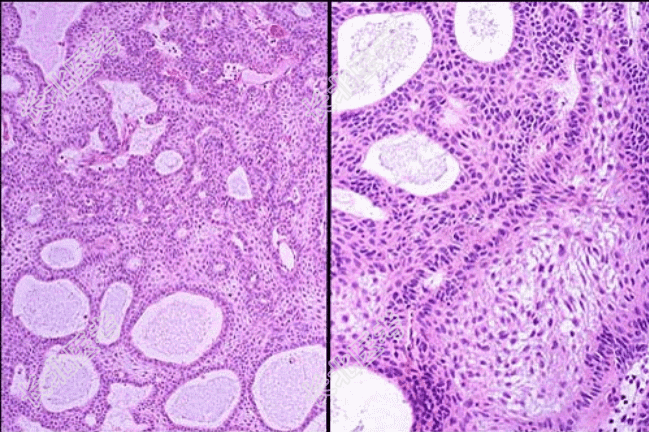 - [材料题] 患者男性,18岁,因颅内肿瘤手术,术中见肿瘤位于蝶鞍上部,球形,有包膜,直径3cm。术后巨检肿块囊实性,囊内充满淡黄色液体,实性区灰白色,质硬,镜检如图,临床诊断为颅咽管瘤。