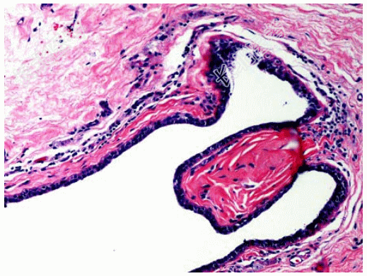- [材料题] 患者女性,35岁,左乳头红肿触痛半月余,溢液一周。乳晕下扪及边界不清硬结,切除左乳送检,大体见乳头乳晕下区数条输乳管扩张扭曲,管腔扩张,直径1~2cm,管腔内充满棕黄色糊状物,管周有灰白色纤维性厚壁。镜下见乳腺小叶间质内出现扩张的导管,管腔内见脱落上皮细胞及脂质分泌物,导管周围纤维组织增生伴淋巴细胞浸润(如图)。临床诊断为乳腺导管扩张症。