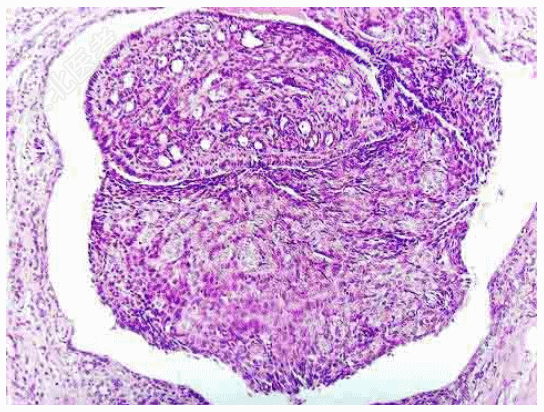 - [材料题] 女性,35岁,左侧乳头血性溢液半月余,乳头附近扪及柔软、樱桃大小包块,尚可活动。超声显示肿块界限清楚,低回声结节。手术切除,显微镜下管腔内见树枝状结构,乳头和导管共存(如图)。临床诊断为导管内乳头状瘤。