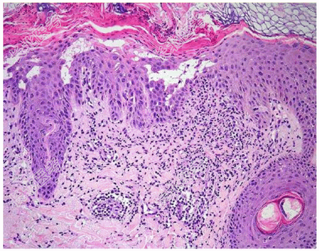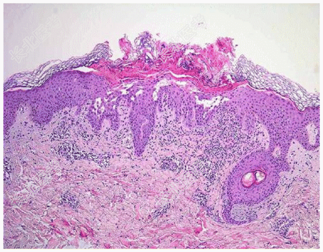 - [材料题] 患儿男,5岁,因“面部、胸部及躯干见对称性小丘疹”来诊。查体:面部、胸部及躯干见对称性密集的角化性小丘疹,粟粒大,皮色,坚实,表面被覆油腻性痂,去痂后可见丘疹顶端漏斗状凹陷。提示:光镜下组织形态如图所示。病理诊断为毛囊角化病。