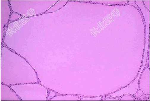- 简答题1、巨检甲状腺组织不整形,切面呈多结节状,灰黄色,部分半透明胶样如图,镜检如图,请作出相应的诊断?