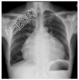 - [材料题] 患者,男性,51岁,腹胀1月余入院。查体:腹围增大,移动性浊音阳性。心界扩大,心音遥远。行胸部平片检查。