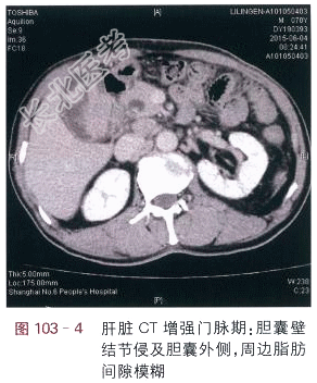 读片分析:肝脏CT平扫:胆囊内见多个结石,胆囊壁内侧呈局限性增厚,形态不规则(见图103-1),肝脏CT增强扫描动脉期:胆囊壁结节呈明显强化,结节呈分叶状,并侵及胆囊壁外侧(见图103-2),门脉期、延时期:胆囊壁结节侵及胆囊外侧,周边脂肪间隙模糊(见图103-3)。