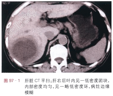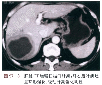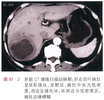 读片分析:肝右后叶包膜下见一低密度团块,呈囊性,内部密度均匀,见一略低密度囊壁,病灶边缘模糊(见图97-1),肝脏CT增强扫描:肝右后叶病灶囊壁呈环形强化,表现为“靶征”,病灶中央为低密度,周边见强化环,环周边为低密度区,病灶边缘模糊(见图97-2~图97-3)。