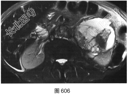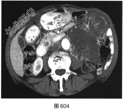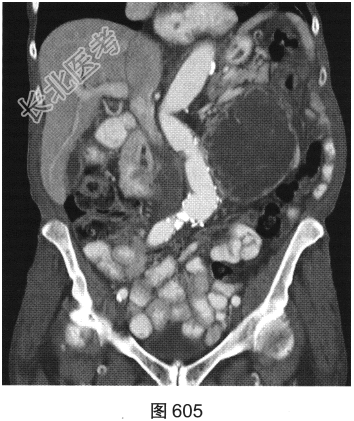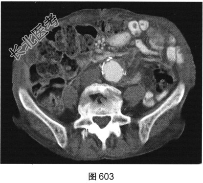- [材料题] 患者女性,85岁,腹主动脉瘤破裂手术修复后,腹部疼痛。患者行腹部CT检查,见图603~图607。