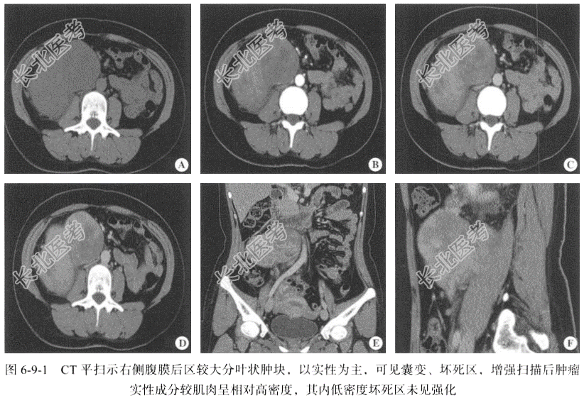 【手术所见】可见腹膜后直径约16cm肿块,位于右肾下极下方、回盲部下方,并向上推移升结肠,左侧挤压输尿管,毗邻右侧腰大肌,肿块质硬,固定,有完整的包膜,肿块表面可见多发曲张的静脉血管,肿块大部分切除后,仔细结扎肿瘤滋养血管,送快速冰冻病理检查。 【病理所见】腹膜后肿物,包膜完整,表面呈灰红色,切面呈灰黄色、灰白色,质韧,病理诊断结合HE形态及免疫表型,符合平滑肌肉瘤(图6-9-2),局灶伴坏死,核分裂象为10~37个/HPF。免疫组化结果:CK-Vim(+),PR(+),S-100(-),CD117(-),Desmin(灶+),SMA(+),h-Caldsmon(-),Ki-67(40%+),MyoD1(-),CD34(-),STAT6(-)。