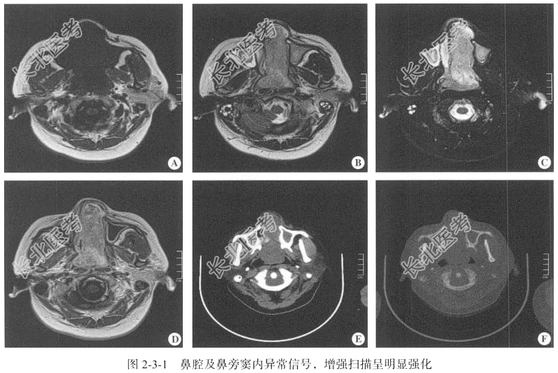 【鼻腔MRI检查】仰卧位,横断位扫描,包括T₁WI、T₂WI及T₂WI脂肪抑制序列,扫描范围自上齿槽至额窦以下,扫描层厚为5mm,层间隔0.5mm,矩阵256×512;以冠状位T₂WI,矢状位T₂WI FLAIR序列平扫后行横断位、冠状位及矢状位的增强扫描。