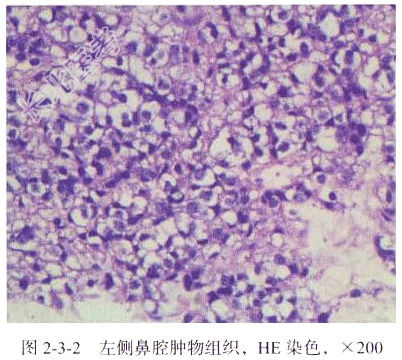 【手术所见】左侧鼻腔内肿物,色泽灰白,质韧,鼻中隔被肿瘤压迫,骨质吸收缺如,呈穿孔状态,右侧中鼻甲内侧面受压。部分筛窦呈息肉样改变。 【病理所见】肉眼:(左侧鼻腔肿物)不整组织一堆,大小为4cm×3cm×2cm,呈灰白灰黄色、质中。病理诊断:(左侧鼻腔肿物)结合HE染色及免疫结果,符合嗅神经母细胞瘤,大小为4cm×3cm×2cm。镜下可见小圆形细胞、梭形细胞、细胞核、神经束等结构,肿瘤细胞核深染,胞质少,细胞密集排列,局部可见肿瘤性坏死,异型性明显(图2-3-2)。免疫组化结果A3:CD3(-),CD20(-),S-100(-),A103(-),HmB45(-),Vim(+),AE1/AE3(-),CAM5.2(-),Ki-67(40%+),CD34(-)Desmin(-),SOX10(少+),Myogenin(-),MyoD1(-),SMA(-),Syn(+),CgA(+),CD56(-),P63(-),CD99(-),CD38(-),WT1(-)。