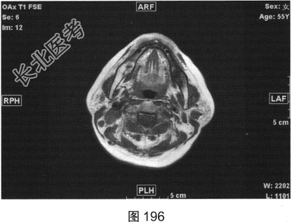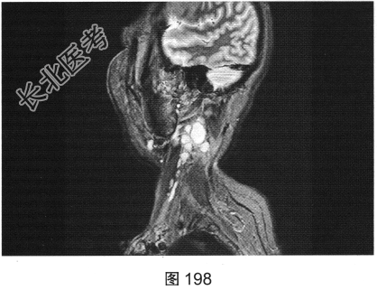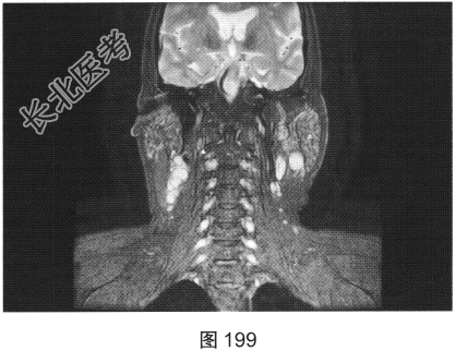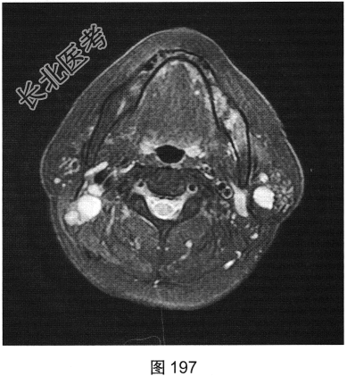 - 简答题2、患者行颈部平扫MRI检查,如图196~图199所示。请问患者MRI检查的阳性影像学表现有哪些?