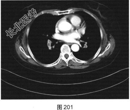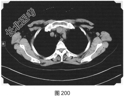 - 简答题4、该患者行颈部淋巴结活检,组织病理学结合免疫组织化学染色,考虑非霍奇金淋巴瘤弥漫大B细胞型。对该患者进一步行胸部、腹部、盆腔增强CT检查,如图200、图201所示。请问患者以上CT检查可见哪些影像异常?