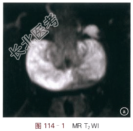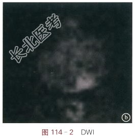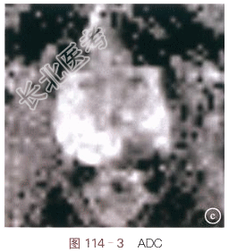 读片分析:图114-1MR-T₂WI脂肪抑制像示左侧外周带有一低信号结节,其边界不清,边缘不光整,信号不均匀,包膜完整,周围脂肪间隙清晰;图114-2DWI示病灶呈明显高信号灶,图114-3ADC示病灶呈明显低信号灶,ADC约为0.78×10-3mm2/s;图114-4T₁WI增强示病灶有早期强化。