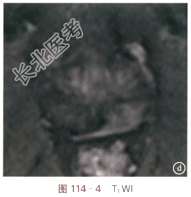 - [材料题] 男性,70岁,无不适,体格检查PSA升高。体格检查:直肠指检前列腺无明显包块,局部质硬。血检:PSA总(t)7.996,游离(f)0.694,f/t:0.087。影像学资料如图114-1~图114-4所示。