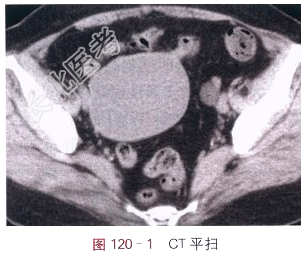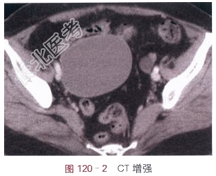 - [材料题] 女,78岁,自觉腹部肿块3月余。体格检查:右下腹肿块,边界清,质地软。影像学资料如图120-1~图120-2所示。