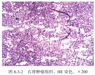 【手术所见】麻醉生效后,留置导尿管,患者取左侧卧位,于腋后线第12肋下缘切2cm小口,分开皮下、肌层、腰背筋膜,进入腹膜间隙,伸示指于其下,前推腹膜,置入自制气束,充气700ml,保留5分钟后取出。于腋前线第12肋下缘,腋中线髂嵴上2cm,各穿刺置入0.5cm及1.0cm Trocar。于腋后线置入1.0cm Trocar,缝合皮肤,防止漏气。看清膈肌顶及腰大肌,将肾周筋膜沿腰大肌表面上下推开,靠腰大肌上方打开肾周筋膜。将肾向内侧推离,找到肾动、静脉。将肾动、静脉分离出,分离表面及周围淋巴管并电凝切断,同法处理肾静脉周围淋巴管。游离肾周间隙,完全游离肾下极,再由肾下极逐步分离至肾上极,肿瘤位于肾中极,游离肾脏,分出输尿管,将输尿管周围及表面组织分离松解。游离出动脉,并使用动脉夹阻断肾脏血流,距肿瘤约0.5cm处环形切开肾包膜,用超声刀切开分离肾组织,切除肾肿瘤组织,送病理检查。 【病理所见】(右肾肿瘤)光镜下见肿瘤细胞管状、腺泡状排列,细胞形态一致,大小为5cm×3.5cm×3cm(图8-3-2)。免疫组化结果:WT1(-),CD57(+),Desmin(-),P504s(-),EMA(-),AE1/AE3(-),CK7(-),CK18(+),Vim(+)。