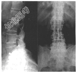 - [材料题] 患者,男,28岁。腰部疼痛不适一年余,脊柱活动受限。血清类风湿因子阴性。X线平片见下图。