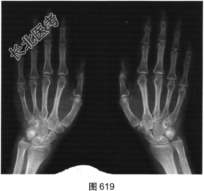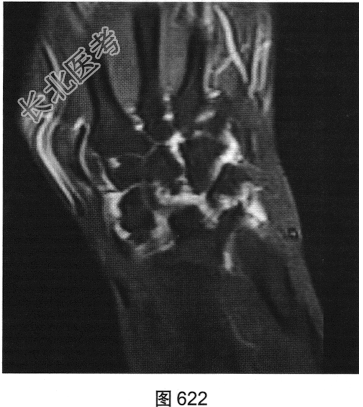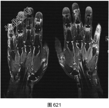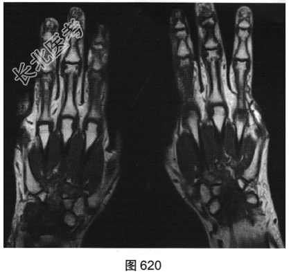 - 简答题2、患者行双手X线及MRI检查,见图619~图622。请问X线平片及MRI图像有哪些阳性表现?