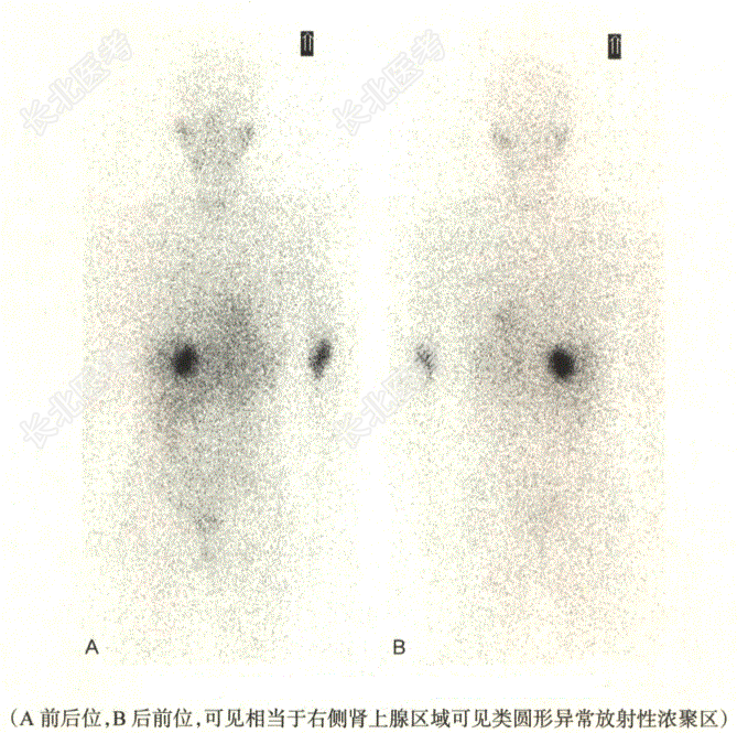 - [材料题] 患者,男,69岁,阵发胸闷、心悸、大汗半年;24h尿生化检查提示儿茶酚胺水平明显升高;腹部CT提示右肾上腺占位。既往高血压病史多年。肾上腺髓质显像:全身显像示右侧肾上腺区域可见一类圆形异常放射性浓聚区,其放射性摄取强度明显高于肝脏,其他部位未见异常放射性增高区或放射性减低区。
