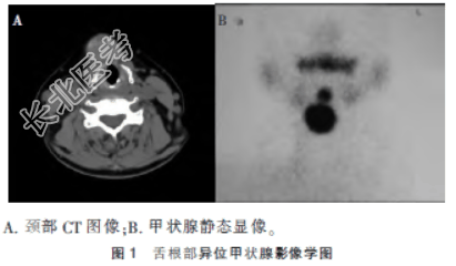 实验室检查:促甲状腺激素(TSH)为29.12μIU/mL(正常值:0.35~4.94μIU/L),游离甲状腺素(FT4)为7.71pmol/L(正常值:9.01~19.05pmol/L)。颈部CT:甲状软骨前缘软组织团块,舌根部结节,甲状腺区未见正常甲状腺显影(图1A)。超声检查:甲状腺区未见明显甲状腺回声,颈前部皮下可见一大小约29mm×21mm×26mm的不均质回声包块,界清,形态规则,内见多发无回声区,实性部分可及少许血流信号,颈部未见明显异常淋巴结声像。⁹⁹ᵐTc甲状腺静态显像:甲状腺术后改变,甲状腺峡部区见2处放射性浓聚影,边缘欠规整,位于上缘近舌骨区(图1B)。