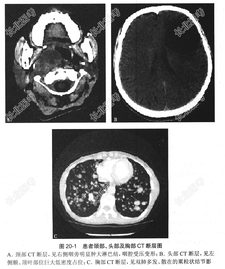 - [材料题] 患者女性,48岁,自诉36年前行“甲状腺右叶包块切除术”,术后病理结果提示为“甲状腺乳头状癌。术后患者未行¹³¹I治疗,病程中未定期随访及服用甲状腺激素替代抑制治疗。3个月前患者自感颈部再次出现多个肿大包块,伴胸痛、咳嗽、呼吸困难、头痛及头晕等不适,行头、颈及胸部CT检查,部分断层图见图20-1。