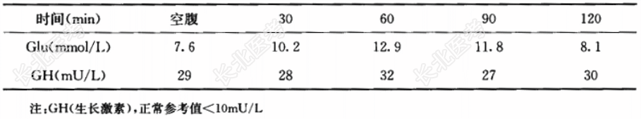 - [材料题] 54岁男性患者,因头痛、出汗及视力下降就诊。患者口唇增厚,耳鼻增大,舌肥大,喉头厚大,手足增宽增大。头部骨骼变化,颅骨面部增宽增长,上颌、前额、眉弓、枕骨粗隆、下颌骨及颧骨突出与增大,皮肤粗厚,头枕部皮肤多有松垂皱纹,头痛乏力,多汗,腰酸背痛,手足肥大,脊柱骨增宽。患者糖抑制试验及葡萄糖耐量试验结果如下表。