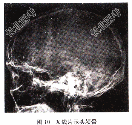 - 简答题2、血清蛋白电泳及血免疫固定电泳均未见异常,尿本周蛋白阴性。X线片示头颅骨(图10)、部分颈椎、肋骨、局部锁骨、双侧肩胛骨、右肱骨、骨盆构成诸骨、双侧股骨上段见弥漫雪点状骨质破坏影。全身骨扫描骨髓象示颅骨、胸骨、双侧肋骨、脊椎骨、右侧髂骨等处可见多个显像剂分布异常浓聚影。该患者最可能的初步诊断是?