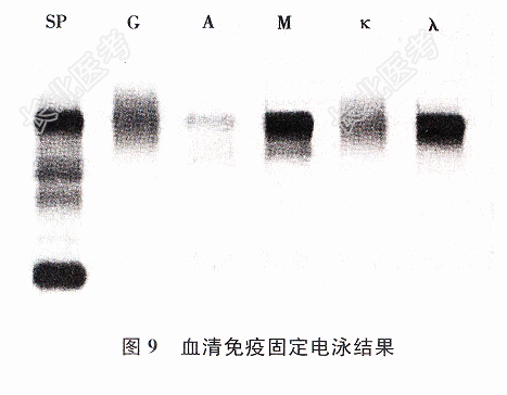 - 简答题2、患者血κ3.16g/L、λ10.1g/L、κ/λ0.3。血清免疫固定电泳结果如图9所示。该患者最可能的初步诊断是?