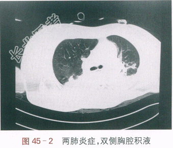 血常规:WBC16.51×10⁹/L,N91.2%,RBC3.27×10¹²/L,PLT257×10⁹/L。肝功能:TB/DB15.8/6.2(μmol/L),A/G30/29(g/L),ALT/AST232/294(IU/L)。肾功能:Scr132μmol/L,UA410μmol/L,BUN32.2mmol/L。CRP194.1mg/L;血钙1.75mmol/L;血甘油三酉旨10.9mmol/L。淀粉酶(AMY)390IU/L,脂肪酶245IU/L。血气分析:pH7.46,PaCO₂25mmHg,PaO₂71mmHg,HCO₃⁻18.6mmol/L,BE(B)-3.4mmol/L,SpO₂95%。腹部CT平扫提示:胰腺明显肿胀,边缘毛糙,周边及腹腔部分系膜、脂肪层结构模糊、密度增高,双侧肾前筋膜明显增厚,肝脏边缘光滑,胆管无扩张。考虑急性胰腺炎伴腹腔渗出,腹、盆腔积液(见图45-1)。胸部CT平扫提示:双侧少量胸腔积液,两肺下叶部分膨胀不全(见图45-2)。