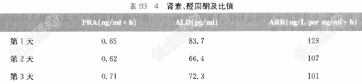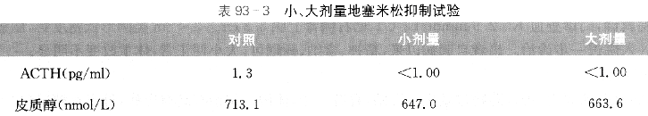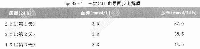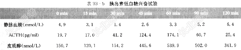 诊治经过:入院后进一步完善检查,结果如下。血常规:Hb138g/L,PLT243×10⁹/L,WBC8.75×10⁹/L,N77.9%。电解质:Na⁺148mmol/L,K⁺3.2mmol/L,Cl⁻104mmol/L,CO₂31mmol/L,阴离子隙14mmol/L。肝肾功能、血脂、肿瘤标志物、甲状腺功能、性激素全套等均无明显异常。血尿同步电解质提示经肾失钾(见表93-1)。ACTH及皮质醇节律检查提示节律消失,且ACTH水平明显偏低(见表93-2)。大小剂量地塞米松抑制试验均提示皮质醇不能被抑制(见表93-3)。血肾素及醛固酮水平均偏低(见表93-4)。血变肾上腺素11.64ng/L,血间变肾上腺素10.76ng/L。垂体MRI增强检查未见明显异常。肾上腺增强CT:右侧肾上腺见一类圆形异常密度阴影,边界清楚光滑,大小约3.0cm×2.3cm,增强后病灶轻中度强化,考虑腺瘤较嗜铬细胞瘤机会大,左肾上腺未见异常。动态血压:收缩压大于140mmHg占总测值57.3%.舒张压大于90mmHg占总测值72.0%;夜平均血压140mmHg/92mmHg,日平均血压142mmHg/98mmHg,全天平均血压141mmHg/96mmHg;夜昼比值为收缩压0.99,舒张压0.94。结合患者病史、实验室检查结果,诊断为库欣综合征(肾上腺来源),转泌尿外科手术治疗,术后病理示右肾上腺皮质腺瘤伴嗜酸性变。术后血压控制改善,口服厄贝沙坦150mg/d治疗,血压控制在130mmHg/85mmHg左右。半年后门诊随访,查8am ACTH28.6pg/ml,皮质醇205.4nmol/L,血Na⁺142mmol/L,血K⁺4.4mmol/L。胰岛素低血糖兴奋试验提示肾上腺储备功能良好(见表93-5),继续予厄贝沙坦片150mg/d降压。随访至今,患者血压平稳,血钾正常,一般情况可。
