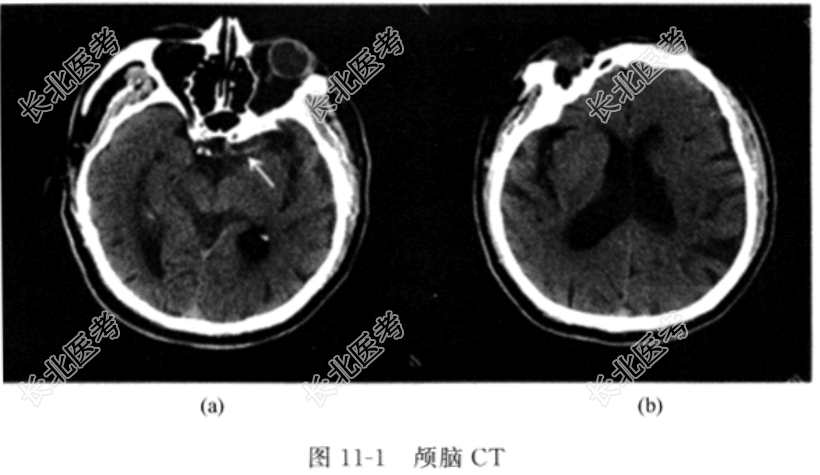 - [材料题] 患者,男性,78岁,主因“突发右侧肢体无力伴言语不能2h”于急诊就诊。患者2h前在家中活动时突然出现右侧肢体无力,完全不能活动,伴有言语不能,能听懂他人的言语,但自己表述不清楚,双眼向左侧凝视,无恶心、呕吐,无大小便失禁,无肢体抽搐,无全身出汗。自发病以来,未进饮食,未解大小便。既往史高血压30余年,血压最高180/90mmHg,规律口服缬沙坦控制血压,血压控制在140/80mmHg左右;糖尿病20余年,口服二甲双胍和阿卡波糖控制血糖,血糖控制良好;高脂血症10年,长期口服辛伐他汀治疗;冠心病5年,房颤3年,未特殊治疗。个人史吸烟40余年,约20支/天,已戒烟2年;否认饮酒史。护理检查体温36.5℃,呼吸18次/分,心率98次/分,血压150/90mmHg。心律绝对不齐,心音强弱不等,心率大于脉率。神志清楚,运动性失语,表情淡漠,双眼左向凝视,伸舌不配合。右侧肢体肌力0级,肌张力降低,左侧肢体肌力5级,肌张力降低,右侧病理征阳性。辅助检查颅脑CT检查示CT左侧大脑中动脉高密度征[图11-1(a)],CT未见明显低密度影[图11-1(b)]。